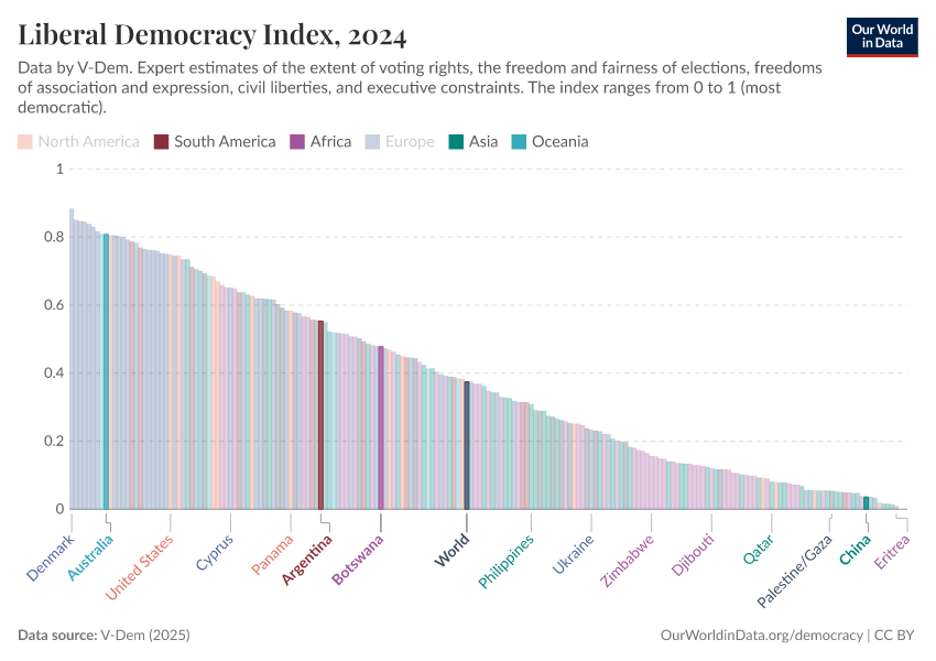 Bastian Herre (2022) - “People around the world have gained democratic rights, but some have many more rights than others” Published online at OurWorldinData.org. Retrieved from: 'https://data-diet-americans.owid.pages.dev:8789/20260119-070102/democratic-world.html' [Online Resource] (archived on January 19, 2026).BibTeX citation