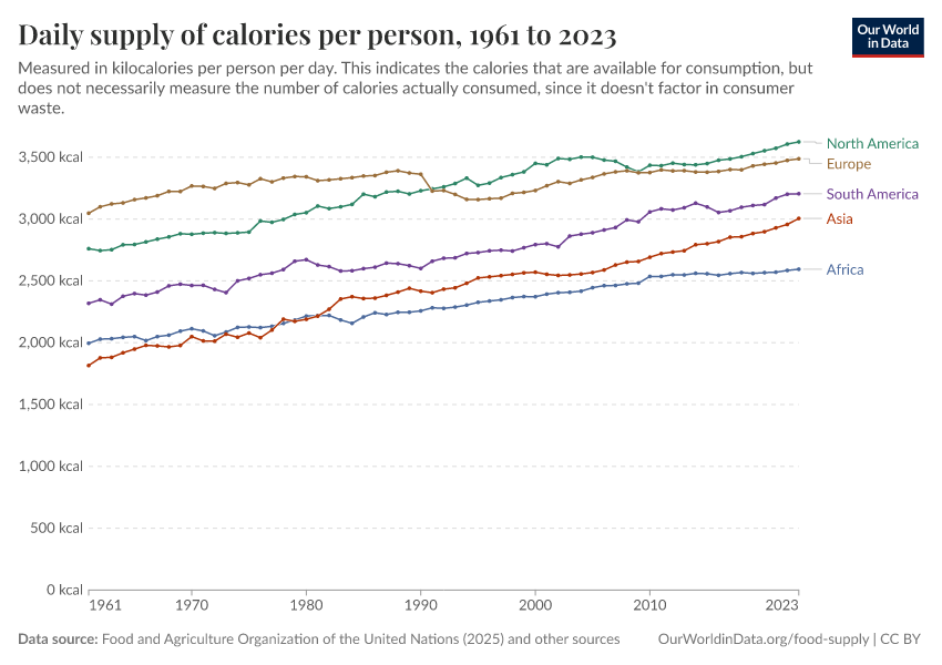 We might naturally think that the explanation for this trend lies in increasing agricultural production. Indeed, the food supply per person has consistently increased in recent decades, as we can see in the interactive line chart shown. The large increase in global population is being met with an even greater increase in food supply (largely due to increases in yields per hectare).
