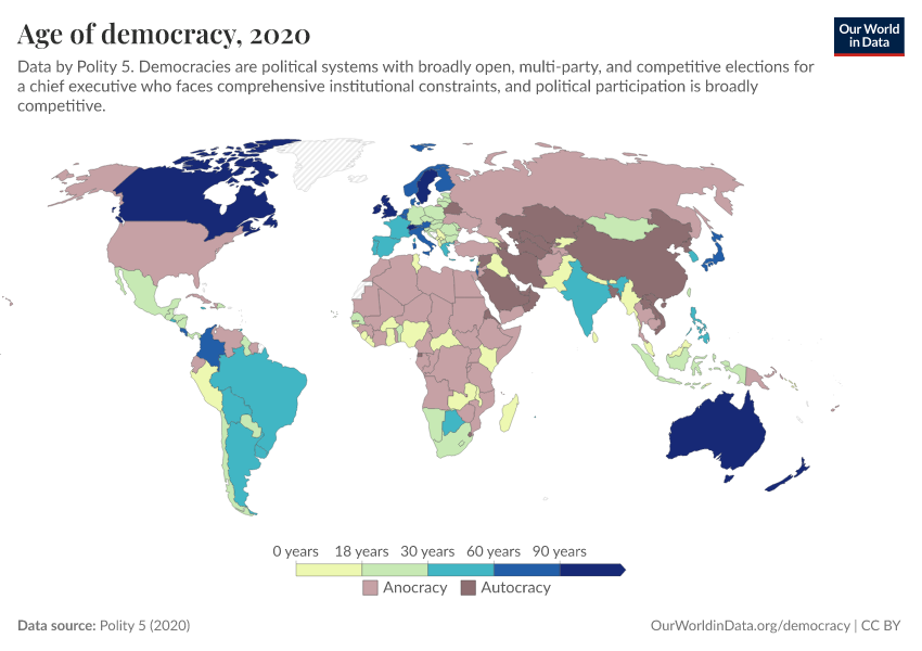 Polity 5 (2020) – processed by Our World in Data. “Age of democracy” [dataset]. Polity 5, “Polity5 Project, Political Regime Characteristics and Transitions, 1800-2018 5” [original data]. Retrieved February 28, 2026 from https://data-diet-americans.owid.pages.dev:8789/20250909-093708/grapher/age-of-democracy-polity.html (archived on September 9, 2025).