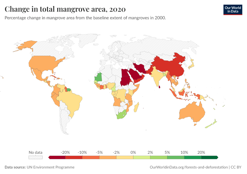 “Data Page: Change in total mangrove area”. Our World in Data (2026). Data adapted from UN Environment Programme. Retrieved from https://data-diet-americans.owid.pages.dev:8789/20260130-180113/grapher/change-in-total-mangrove-area.html [online resource] (archived on January 30, 2026).How to cite this data