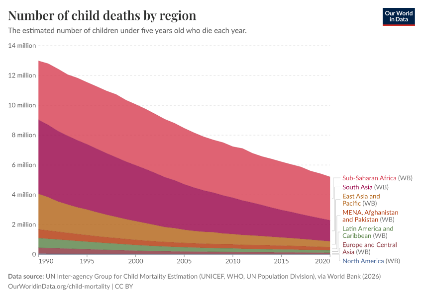 “Data Page: Number of child deaths by region”. Our World in Data (2026). Data adapted from UN Inter-agency Group for Child Mortality Estimation (UNICEF, WHO, UN Population Division), via World Bank. Retrieved from https://data-diet-americans.owid.pages.dev:8789/20260202-180243/grapher/child-deaths-igme-data.html [online resource] (archived on February 2, 2026).How to cite this data