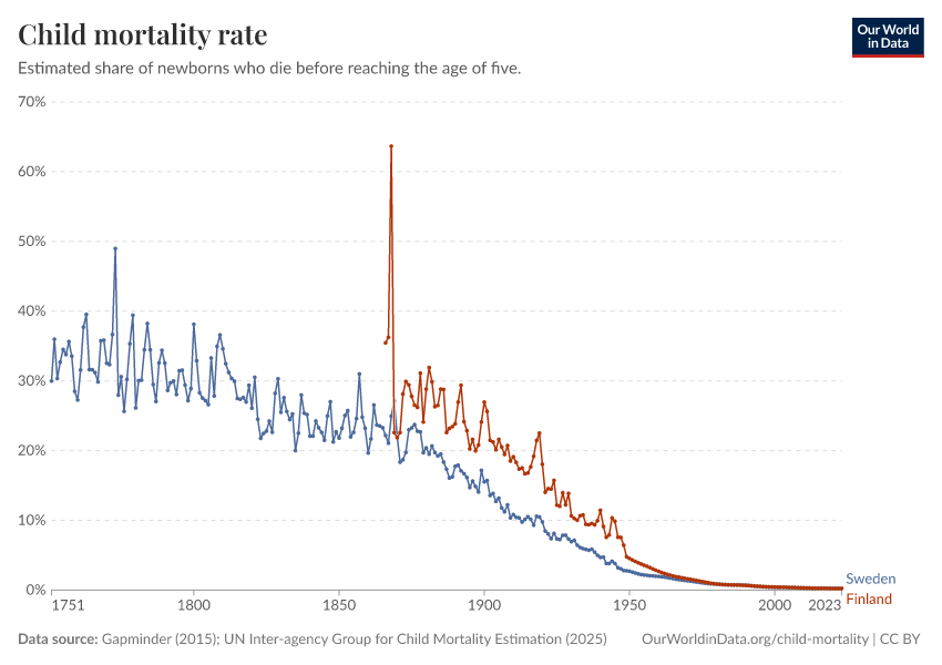 - The historical data makes clear that it doesn’t have to be this way: societies can protect their children and reduce child mortality to very low rates. For child mortality to reach low levels, many things have to go right at the same time: good healthcare, good nutrition, clean water and sanitation, maternal health, and high living standards. We can, therefore, think of child mortality as a proxy indicator of a country’s living conditions.