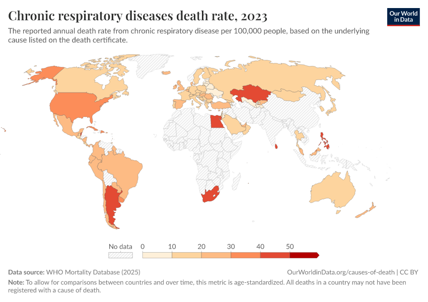 “Data Page: Chronic respiratory diseases death rate”, part of the following publication: Saloni Dattani, Fiona Spooner, Hannah Ritchie, and Max Roser (2023) - “Causes of Death”. Data adapted from WHO Mortality Database. Retrieved from https://data-diet-americans.owid.pages.dev:8789/20250909-093708/grapher/chronic-respiratory-diseases-death-rate-who-mdb.html [online resource] (archived on September 9, 2025).How to cite this data
