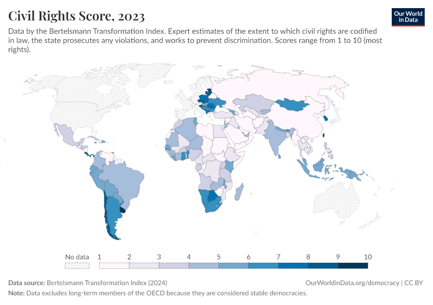 “Data Page: Civil Rights Score”, part of the following publication: Bastian Herre, Lucas Rodés-Guirao, and Esteban Ortiz-Ospina (2013) - “Democracy”. Data adapted from Bertelsmann Transformation Index. Retrieved from https://data-diet-americans.owid.pages.dev:8789/20260204-165456/grapher/civil-rights-score-bti.html [online resource] (archived on February 4, 2026).How to cite this data