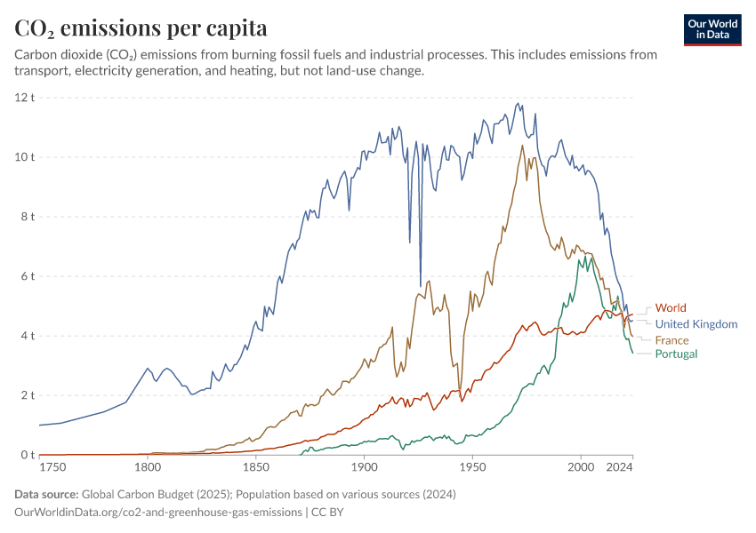“Data Page: CO₂ emissions per capita”, part of the following publication: Hannah Ritchie, Pablo Rosado, and Max Roser (2023) - “CO₂ and Greenhouse Gas Emissions”. Data adapted from Global Carbon Project, Various sources. Retrieved from https://data-diet-americans.owid.pages.dev:8789/20260119-070102/grapher/co-emissions-per-capita.html [online resource] (archived on January 19, 2026).