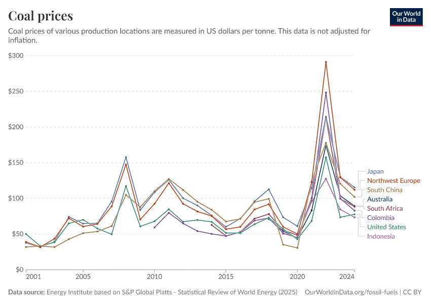 Energy Institute based on S&P Global Platts - Statistical Review of World Energy (2025) – with major processing by Our World in Data. “Coal prices” [dataset]. Energy Institute, “Statistical Review of World Energy” [original data]. Retrieved February 28, 2026 from https://data-diet-americans.owid.pages.dev:8789/20250909-093708/grapher/coal-prices.html (archived on September 9, 2025).