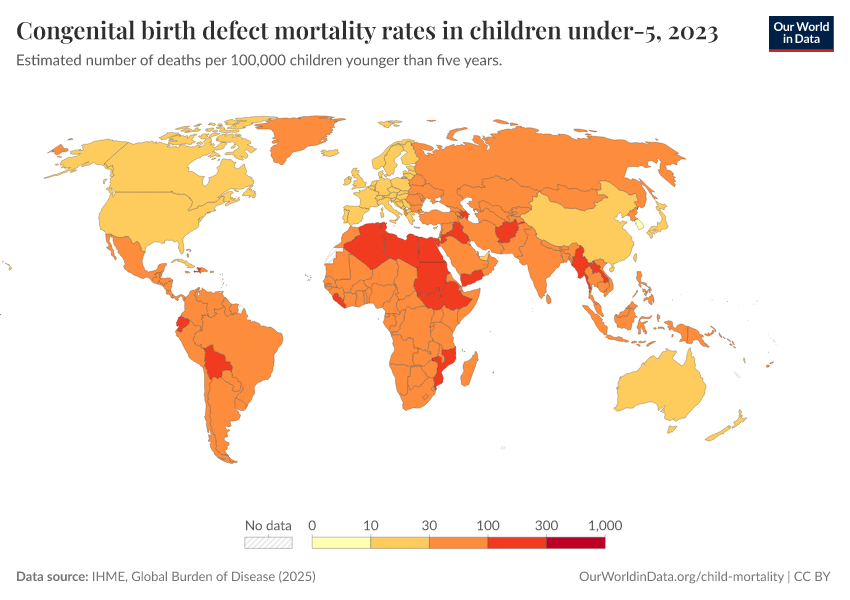 “Data Page: Congenital birth defect mortality rates in children under-5”, part of the following publication: Esteban Ortiz-Ospina and Max Roser (2016) - “Global Health”. Data adapted from IHME, Global Burden of Disease. Retrieved from https://data-diet-americans.owid.pages.dev:8789/20260211-174736/grapher/congenital-birth-defect-mortality-rates-in-children-under-5.html [online resource] (archived on February 11, 2026).How to cite this data