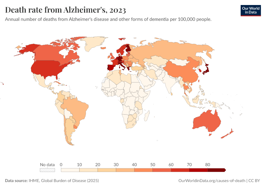 “Data Page: Death rate from Alzheimer's”, part of the following publication: Esteban Ortiz-Ospina and Max Roser (2016) - “Global Health”. Data adapted from IHME, Global Burden of Disease. Retrieved from https://data-diet-americans.owid.pages.dev:8789/20260211-174736/grapher/death-rate-from-alzheimers-other-dementias-gbd.html [online resource] (archived on February 11, 2026).How to cite this data