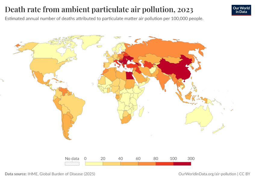 IHME, Global Burden of Disease (2025) – with major processing by Our World in Data. “Death rate from ambient particulate air pollution” [dataset]. IHME, Global Burden of Disease, “Global Burden of Disease - Risk Factors - Deaths” [original data]. Retrieved February 28, 2026 from https://data-diet-americans.owid.pages.dev:8789/20260213-112438/grapher/death-rate-from-ambient-particulate-air-pollution.html (archived on February 13, 2026).