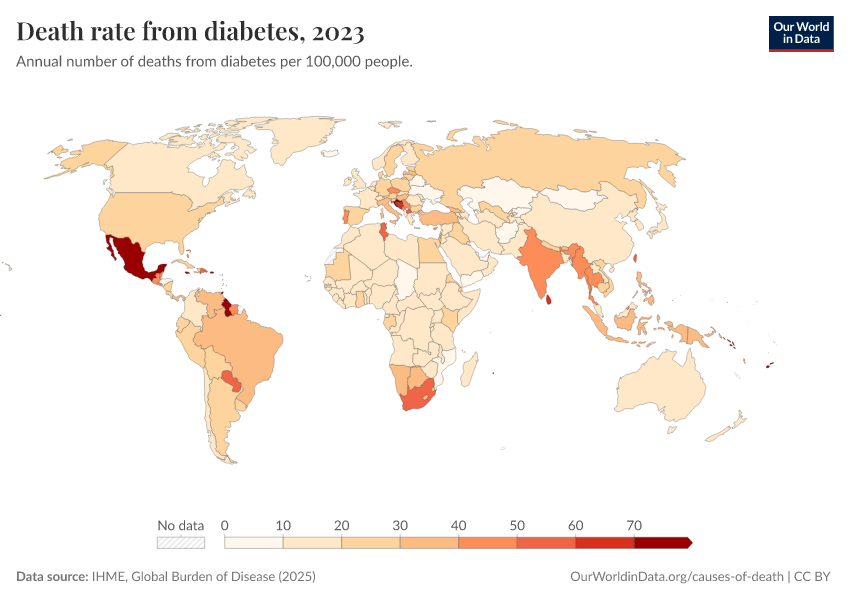 “Data Page: Death rate from diabetes”, part of the following publication: Esteban Ortiz-Ospina and Max Roser (2016) - “Global Health”. Data adapted from IHME, Global Burden of Disease. Retrieved from https://data-diet-americans.owid.pages.dev:8789/20260211-174736/grapher/death-rate-from-diabetes-gbd.html [online resource] (archived on February 11, 2026).How to cite this data
