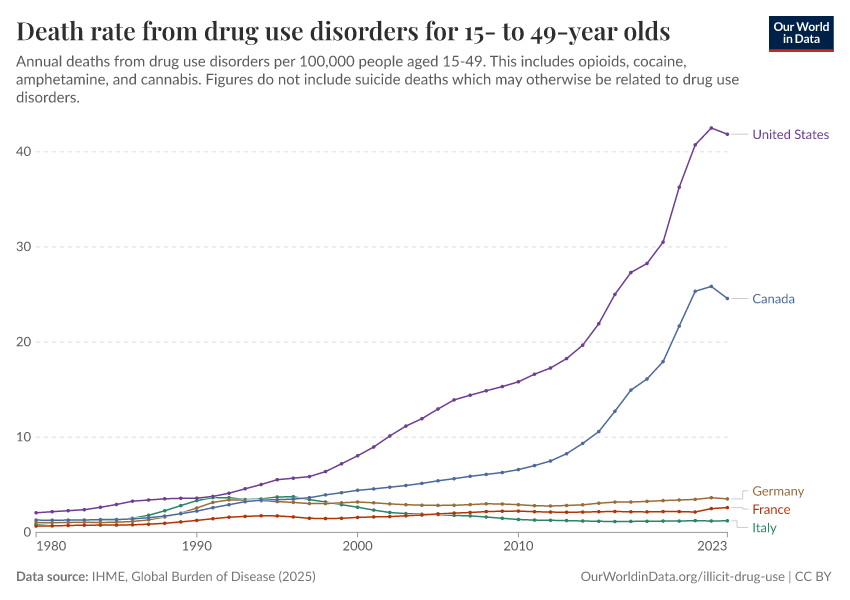 IHME, Global Burden of Disease (2025) – with major processing by Our World in Data. “Death rate from drug use disorders for 15- to 49-year olds” [dataset]. IHME, Global Burden of Disease, “Global Burden of Disease - Deaths” [original data]. Retrieved February 28, 2026 from https://data-diet-americans.owid.pages.dev:8789/20260211-174736/grapher/death-rate-from-drug-use-disorders-for-15--to-49-year-olds.html (archived on February 11, 2026).