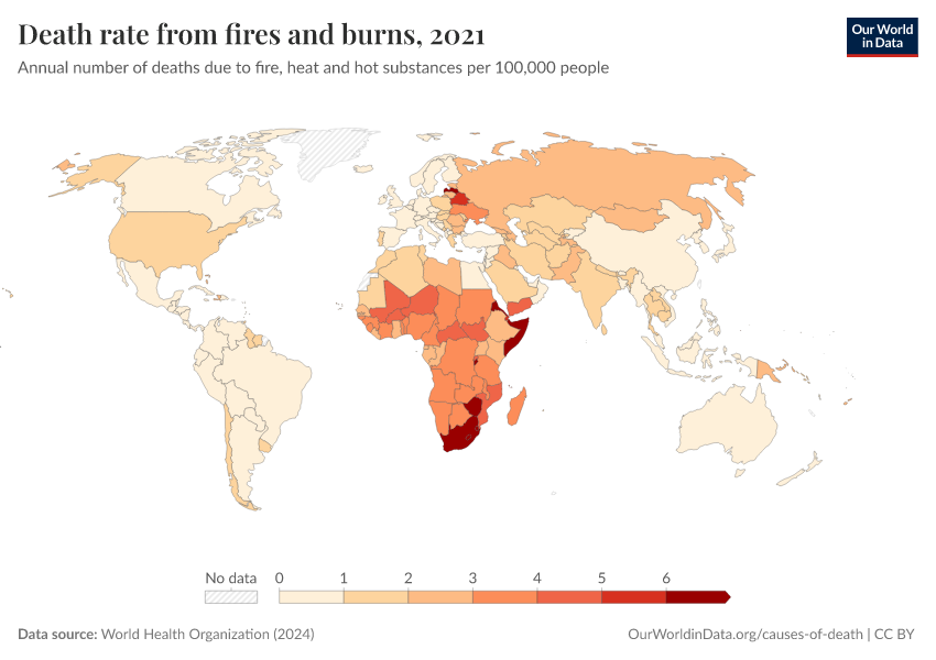 “Data Page: Death rate from fires and burns”, part of the following publication: Esteban Ortiz-Ospina and Max Roser (2016) - “Global Health”. Data adapted from World Health Organization. Retrieved from https://data-diet-americans.owid.pages.dev:8789/20250909-093708/grapher/death-rate-from-fires-and-burns-who.html [online resource] (archived on September 9, 2025).How to cite this data