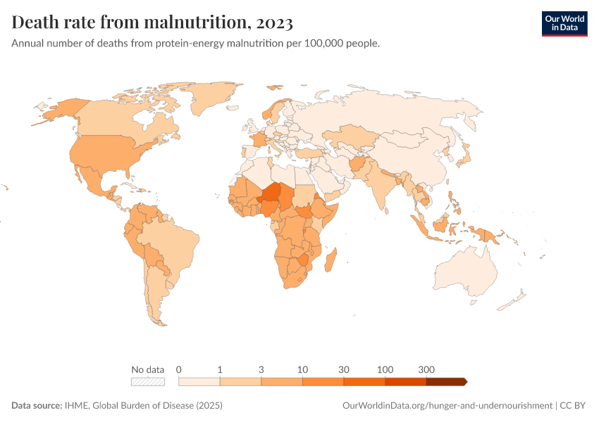 IHME, Global Burden of Disease (2025) – with major processing by Our World in Data. “Death rate from malnutrition” [dataset]. IHME, Global Burden of Disease, “Global Burden of Disease - Deaths” [original data]. Retrieved February 28, 2026 from https://data-diet-americans.owid.pages.dev:8789/20260211-174736/grapher/death-rate-from-malnutrition.html (archived on February 11, 2026).