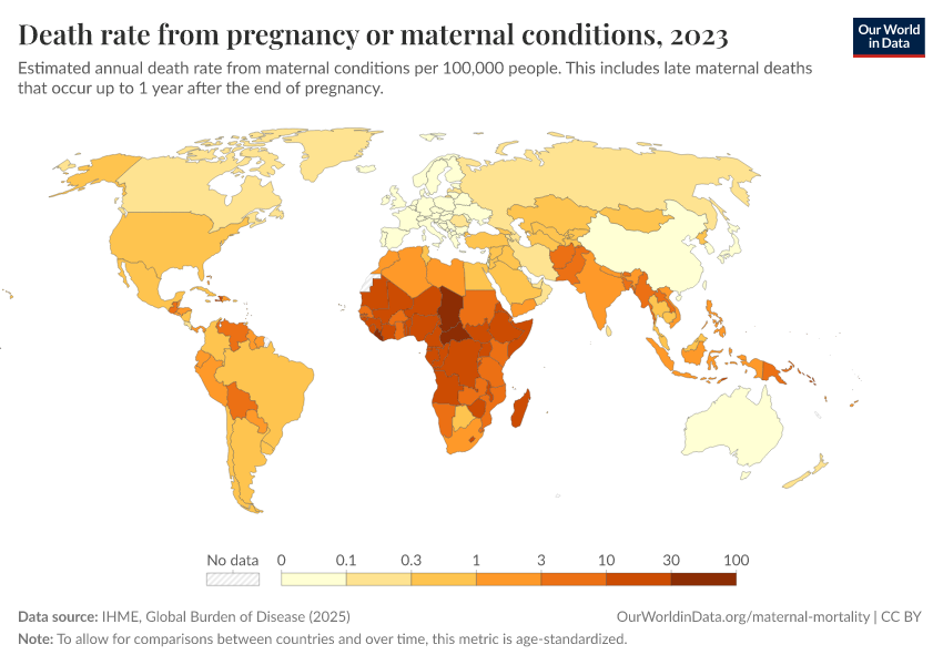 IHME, Global Burden of Disease (2025) – with major processing by Our World in Data. “Death rate from pregnancy or maternal conditions” [dataset]. IHME, Global Burden of Disease, “Global Burden of Disease - Deaths” [original data]. Retrieved February 28, 2026 from https://data-diet-americans.owid.pages.dev:8789/20260211-174736/grapher/death-rate-from-maternal-disorders-ihme.html (archived on February 11, 2026).