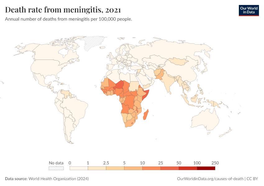 World Health Organization (2024) – with major processing by Our World in Data. “Death rate from meningitis” [dataset]. World Health Organization, “Global Health Estimates” [original data]. Retrieved February 28, 2026 from https://data-diet-americans.owid.pages.dev:8789/20250909-093708/grapher/death-rate-from-meningitis-who.html (archived on September 9, 2025).