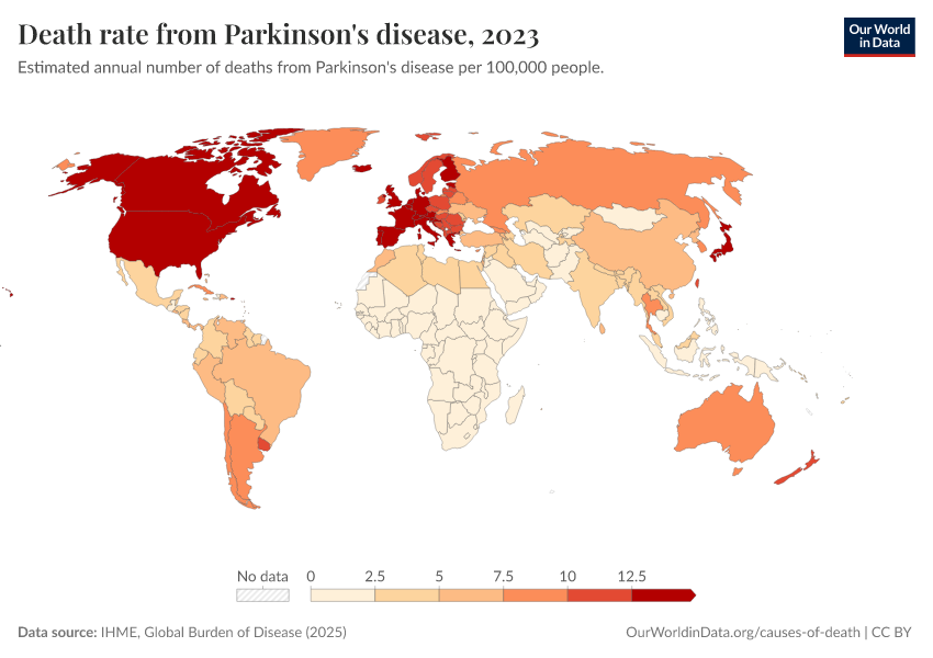 “Data Page: Death rate from Parkinson's disease”, part of the following publication: Esteban Ortiz-Ospina and Max Roser (2016) - “Global Health”. Data adapted from IHME, Global Burden of Disease. Retrieved from https://data-diet-americans.owid.pages.dev:8789/20260211-174736/grapher/death-rate-from-parkinsons-disease-gbd.html [online resource] (archived on February 11, 2026).How to cite this data