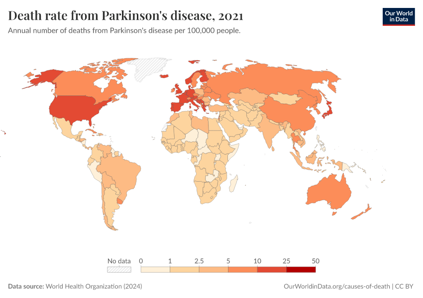 World Health Organization (2024) – with major processing by Our World in Data. “Death rate from Parkinson's disease” [dataset]. World Health Organization, “Global Health Estimates” [original data]. Retrieved February 28, 2026 from https://data-diet-americans.owid.pages.dev:8789/20250909-093708/grapher/death-rate-from-parkinsons-disease-ghe.html (archived on September 9, 2025).