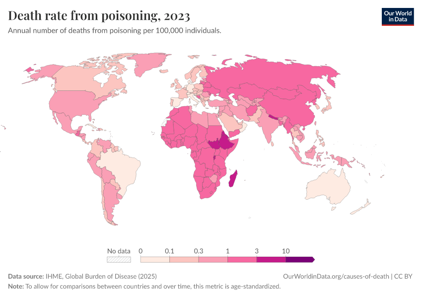“Data Page: Death rate from poisoning”, part of the following publication: Esteban Ortiz-Ospina and Max Roser (2016) - “Global Health”. Data adapted from IHME, Global Burden of Disease. Retrieved from https://data-diet-americans.owid.pages.dev:8789/20260211-174736/grapher/death-rate-from-poisoning.html [online resource] (archived on February 11, 2026).How to cite this data