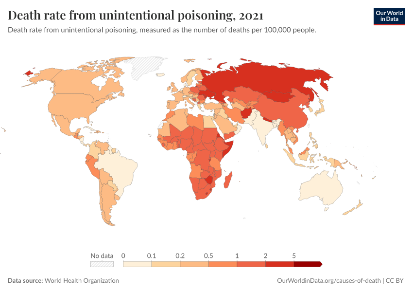 “Data Page: Death rate from unintentional poisoning”. Our World in Data (2026). Data adapted from World Health Organization. Retrieved from https://data-diet-americans.owid.pages.dev:8789/20260130-180113/grapher/death-rate-from-poisonings.html [online resource] (archived on January 30, 2026).How to cite this data