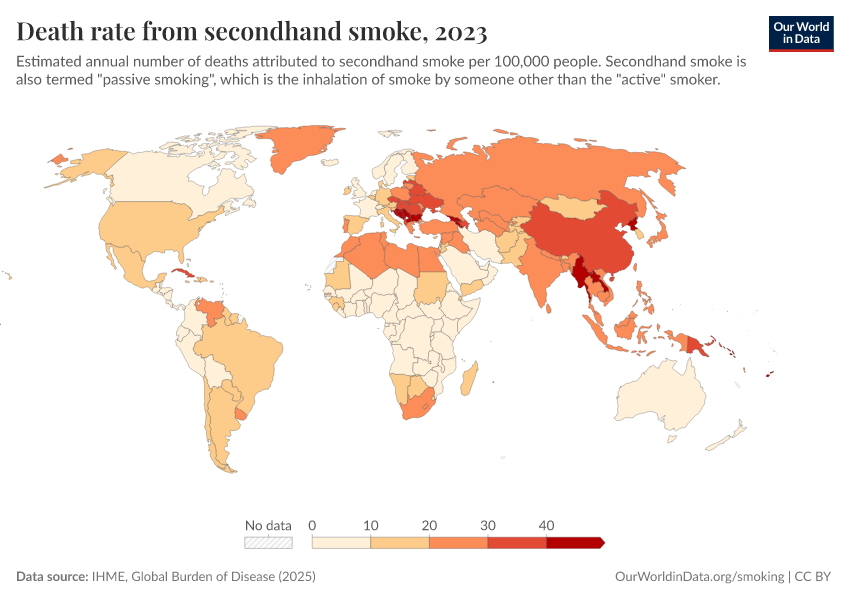 IHME, Global Burden of Disease (2025) – with major processing by Our World in Data. “Death rate from secondhand smoke” [dataset]. IHME, Global Burden of Disease, “Global Burden of Disease - Risk Factors - Deaths” [original data]. Retrieved February 28, 2026 from https://data-diet-americans.owid.pages.dev:8789/20260213-113303/grapher/death-rate-from-secondhand-smoke-gbd.html (archived on February 13, 2026).