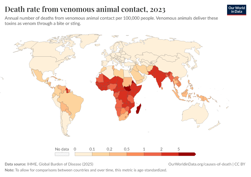 IHME, Global Burden of Disease (2025) – with major processing by Our World in Data. “Death rate from venomous animal contact” [dataset]. IHME, Global Burden of Disease, “Global Burden of Disease - Deaths” [original data]. Retrieved February 28, 2026 from https://data-diet-americans.owid.pages.dev:8789/20260211-174736/grapher/death-rate-from-venomous-animal.html (archived on February 11, 2026).