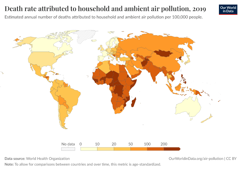 World Health Organization – processed by Our World in Data. “Death rate attributed to household and ambient air pollution” [dataset]. World Health Organization, “Global Health Observatory (GHO), World Health Organisation (WHO)” [original data]. Retrieved February 28, 2026 from https://data-diet-americans.owid.pages.dev:8789/20260130-180113/grapher/death-rate-household-and-ambient-air-pollution.html (archived on January 30, 2026).