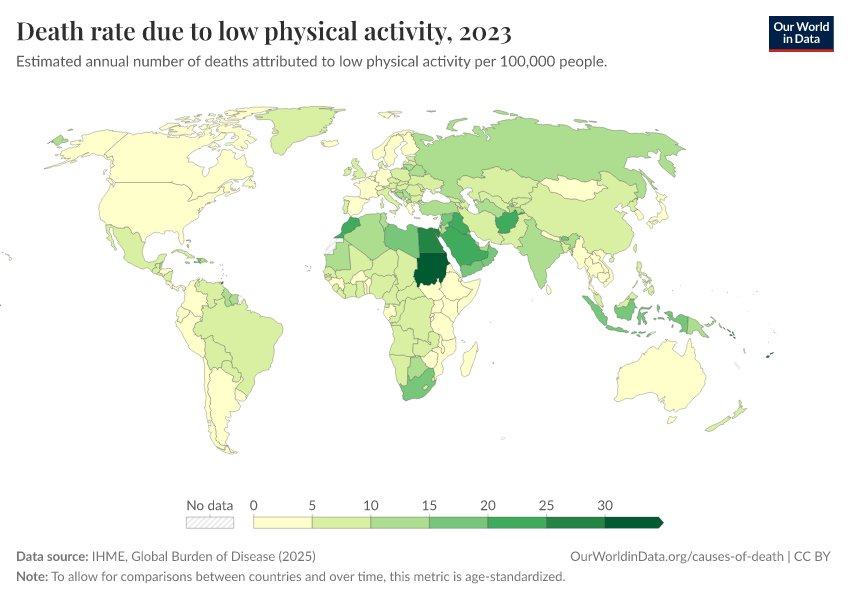 “Data Page: Death rate due to low physical activity”, part of the following publication: Esteban Ortiz-Ospina and Max Roser (2016) - “Global Health”. Data adapted from IHME, Global Burden of Disease. Retrieved from https://data-diet-americans.owid.pages.dev:8789/20260213-112438/grapher/death-rates-due-to-low-physical-activity.html [online resource] (archived on February 13, 2026).How to cite this data