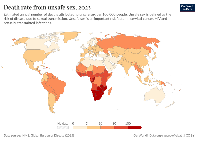 IHME, Global Burden of Disease (2025) – with major processing by Our World in Data. “Death rate from unsafe sex” [dataset]. IHME, Global Burden of Disease, “Global Burden of Disease - Risk Factors - Deaths” [original data]. Retrieved February 28, 2026 from https://data-diet-americans.owid.pages.dev:8789/20260213-113303/grapher/death-rates-from-unsafe-sex-gbd.html (archived on February 13, 2026).