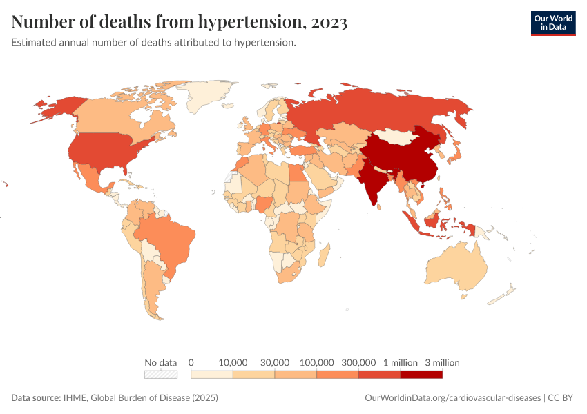 IHME, Global Burden of Disease (2025) – with major processing by Our World in Data. “Number of deaths from hypertension” [dataset]. IHME, Global Burden of Disease, “Global Burden of Disease - Risk Factors - Deaths” [original data]. Retrieved February 28, 2026 from https://data-diet-americans.owid.pages.dev:8789/20260213-112438/grapher/deaths-due-to-high-blood-pressure.html (archived on February 13, 2026).