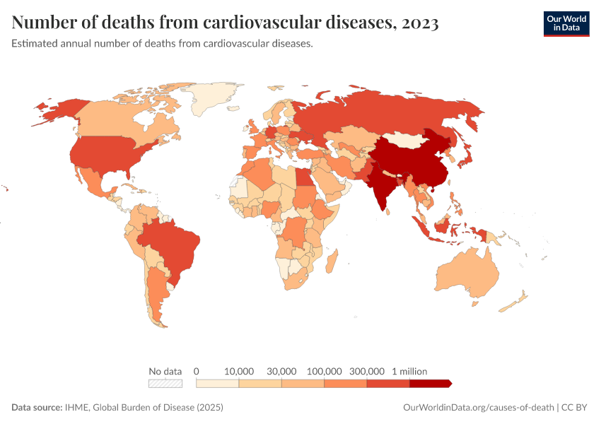 “Data Page: Number of deaths from cardiovascular diseases”, part of the following publication: Esteban Ortiz-Ospina and Max Roser (2016) - “Global Health”. Data adapted from IHME, Global Burden of Disease. Retrieved from https://data-diet-americans.owid.pages.dev:8789/20260211-174736/grapher/deaths-from-cardiovascular-disease.html [online resource] (archived on February 11, 2026).How to cite this data