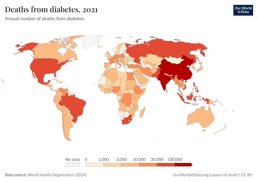 “Data Page: Deaths from diabetes”, part of the following publication: Esteban Ortiz-Ospina and Max Roser (2016) - “Global Health”. Data adapted from World Health Organization. Retrieved from https://data-diet-americans.owid.pages.dev:8789/20250909-093708/grapher/deaths-from-diabetes-ghe.html [online resource] (archived on September 9, 2025).How to cite this data