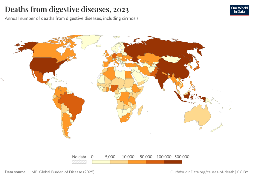 IHME, Global Burden of Disease (2025) – with major processing by Our World in Data. “Deaths from digestive diseases” [dataset]. IHME, Global Burden of Disease, “Global Burden of Disease - Deaths” [original data]. Retrieved February 28, 2026 from https://data-diet-americans.owid.pages.dev:8789/20260211-174736/grapher/deaths-from-digestive-diseases.html (archived on February 11, 2026).