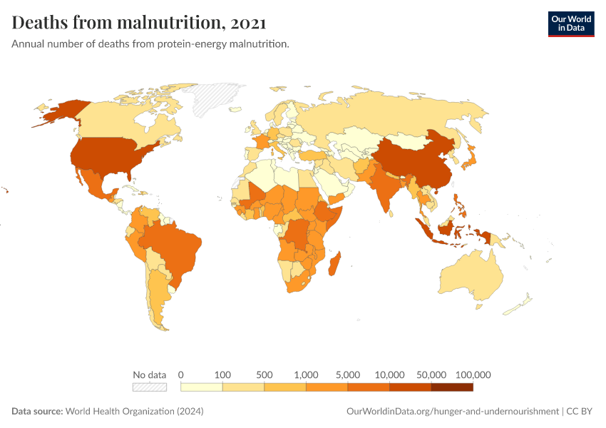 World Health Organization (2024) – with major processing by Our World in Data. “Deaths from malnutrition” [dataset]. World Health Organization, “Global Health Estimates” [original data]. Retrieved February 28, 2026 from https://data-diet-americans.owid.pages.dev:8789/20250909-093708/grapher/deaths-from-malnutrition-ghe.html (archived on September 9, 2025).