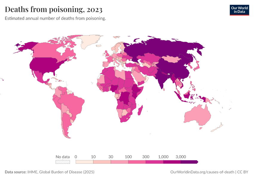 IHME, Global Burden of Disease (2025) – with major processing by Our World in Data. “Deaths from poisoning” [dataset]. IHME, Global Burden of Disease, “Global Burden of Disease - Deaths” [original data]. Retrieved February 28, 2026 from https://data-diet-americans.owid.pages.dev:8789/20260211-174736/grapher/deaths-from-poisoning.html (archived on February 11, 2026).