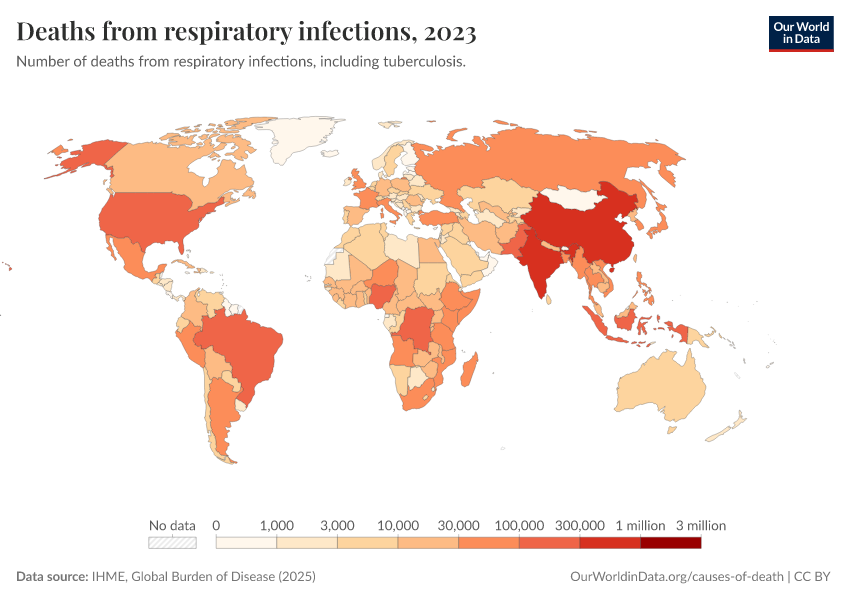 “Data Page: Deaths from respiratory infections”, part of the following publication: Esteban Ortiz-Ospina and Max Roser (2016) - “Global Health”. Data adapted from IHME, Global Burden of Disease. Retrieved from https://data-diet-americans.owid.pages.dev:8789/20260211-174736/grapher/deaths-from-respiratory-infections.html [online resource] (archived on February 11, 2026).How to cite this data