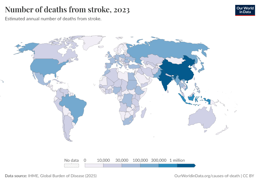 IHME, Global Burden of Disease (2025) – with major processing by Our World in Data. “Number of deaths from stroke” [dataset]. IHME, Global Burden of Disease, “Global Burden of Disease - Deaths” [original data]. Retrieved February 28, 2026 from https://data-diet-americans.owid.pages.dev:8789/20260211-174736/grapher/deaths-from-strokes.html (archived on February 11, 2026).