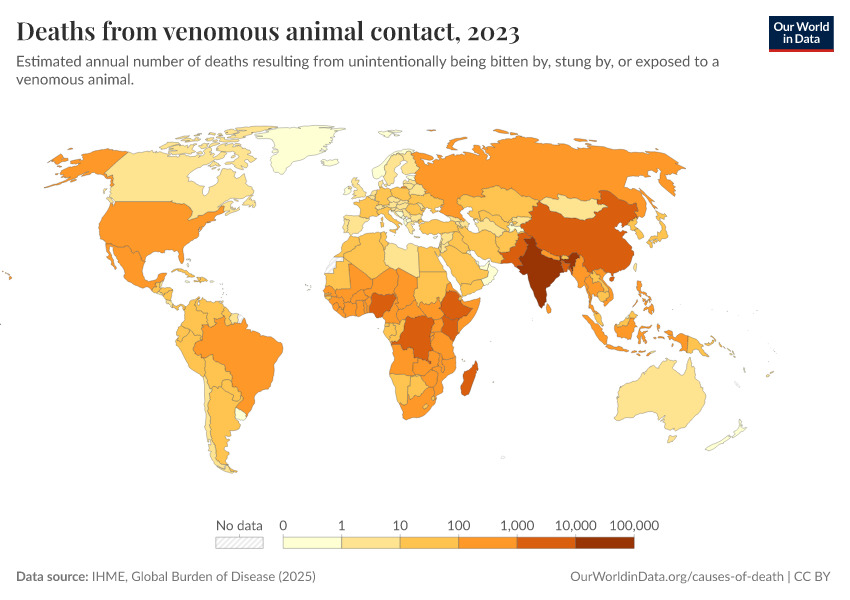 IHME, Global Burden of Disease (2025) – with major processing by Our World in Data. “Deaths from venomous animal contact” [dataset]. IHME, Global Burden of Disease, “Global Burden of Disease - Deaths” [original data]. Retrieved February 28, 2026 from https://data-diet-americans.owid.pages.dev:8789/20260211-174736/grapher/deaths-from-venomous-animal-contact.html (archived on February 11, 2026).