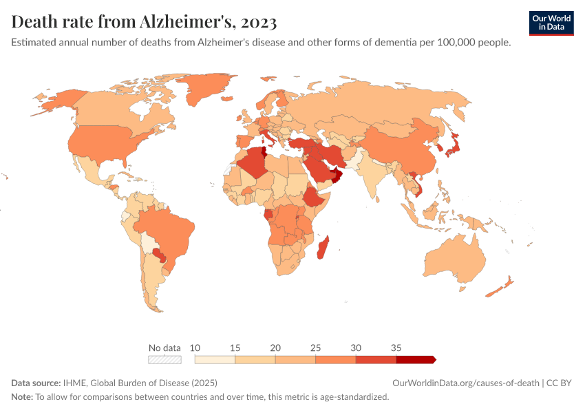 IHME, Global Burden of Disease (2025) – with major processing by Our World in Data. “Death rate from Alzheimer's” [dataset]. IHME, Global Burden of Disease, “Global Burden of Disease - Deaths” [original data]. Retrieved February 28, 2026 from https://data-diet-americans.owid.pages.dev:8789/20260211-173942/grapher/dementia-death-rates.html (archived on February 11, 2026).