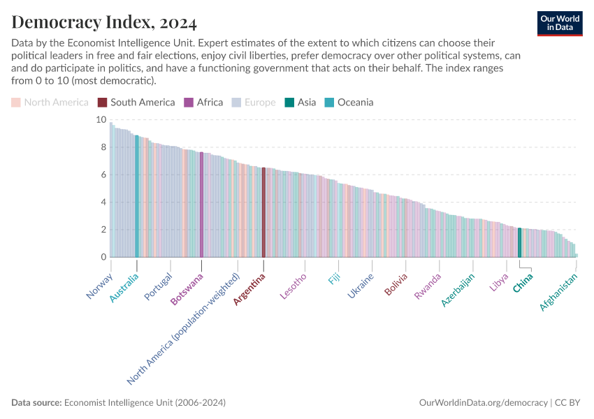 Economist Intelligence Unit (2006-2024) – processed by Our World in Data. “Democracy index – Economist Intelligence Unit” [dataset]. Economist Intelligence Unit, “Democracy Index 2021: The China challenge”; Economist Intelligence Unit, “Democracy Index 2022: Frontline democracy and the battle for Ukraine”; Economist Intelligence Unit, “Democracy Index 2023: Age of Conflict”; Economist Intelligence Unit, “Democracy Index 2024: What's wrong with representative democracy?”; Gapminder, “Democracy Index v4”; Various sources, “Population” [original data]. Retrieved February 28, 2026 from https://data-diet-americans.owid.pages.dev:8789/20260119-070102/grapher/democracy-index-eiu.html (archived on January 19, 2026).