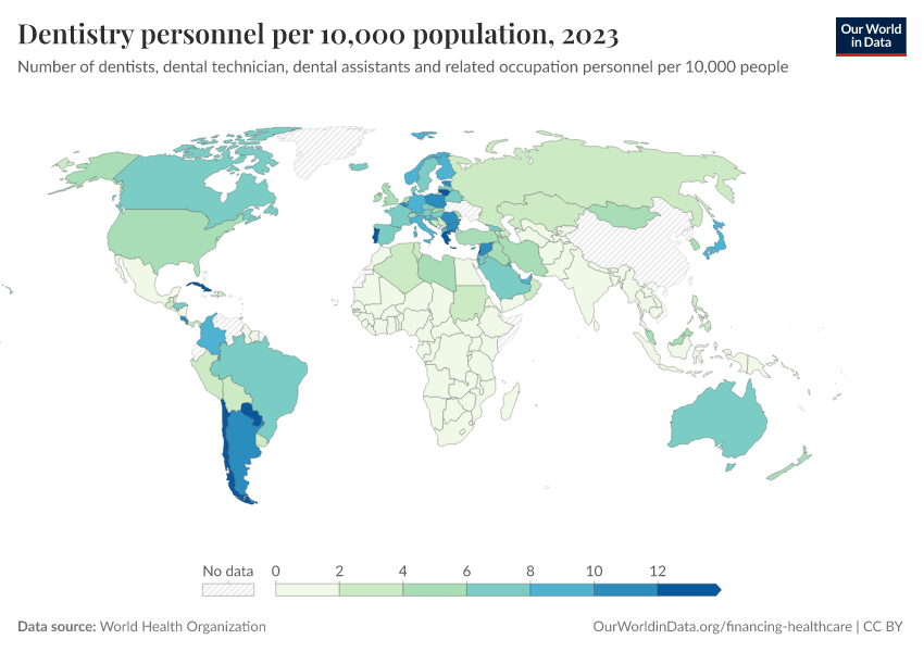 “Data Page: Dentistry personnel per 10,000 population”. Our World in Data (2026). Data adapted from World Health Organization. Retrieved from https://data-diet-americans.owid.pages.dev:8789/20260130-180113/grapher/dentistry-personnel-per-1000.html [online resource] (archived on January 30, 2026).How to cite this data