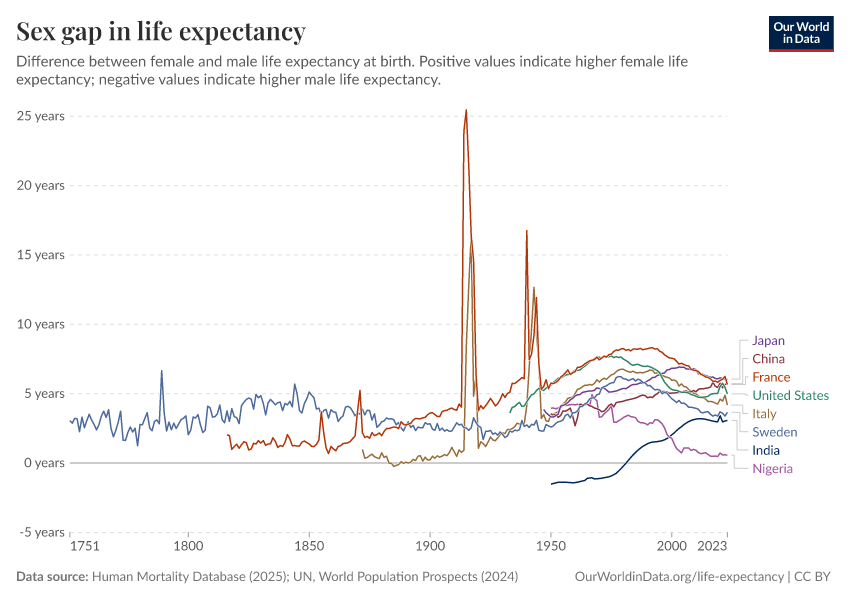 “Data Page: Life expectancy at birth”, part of the following publication: Saloni Dattani, Lucas Rodés-Guirao, Hannah Ritchie, Esteban Ortiz-Ospina, and Max Roser (2023) - “Life Expectancy”. Data adapted from Human Mortality Database, United Nations. Retrieved from https://data-diet-americans.owid.pages.dev:8789/20251022-222946/grapher/difference-in-female-and-male-life-expectancy-at-birth.html [online resource] (archived on October 22, 2025).How to cite this data