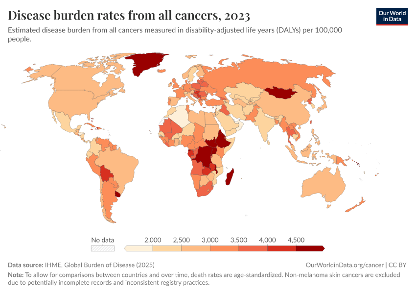 “Data Page: Disease burden rates from all cancers”, part of the following publication: Esteban Ortiz-Ospina and Max Roser (2016) - “Global Health”. Data adapted from IHME, Global Burden of Disease. Retrieved from https://data-diet-americans.owid.pages.dev:8789/20260211-174736/grapher/disease-burden-rates-from-cancers.html [online resource] (archived on February 11, 2026).How to cite this data