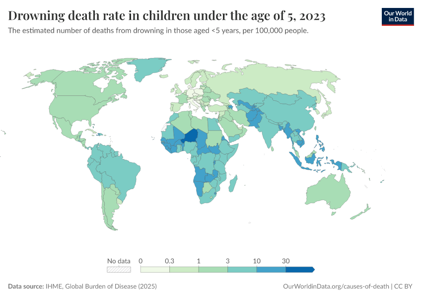 “Data Page: Drowning death rate in children under the age of 5”, part of the following publication: Esteban Ortiz-Ospina and Max Roser (2016) - “Global Health”. Data adapted from IHME, Global Burden of Disease. Retrieved from https://data-diet-americans.owid.pages.dev:8789/20260211-174736/grapher/drowning-death-rates-under-5.html [online resource] (archived on February 11, 2026).How to cite this data