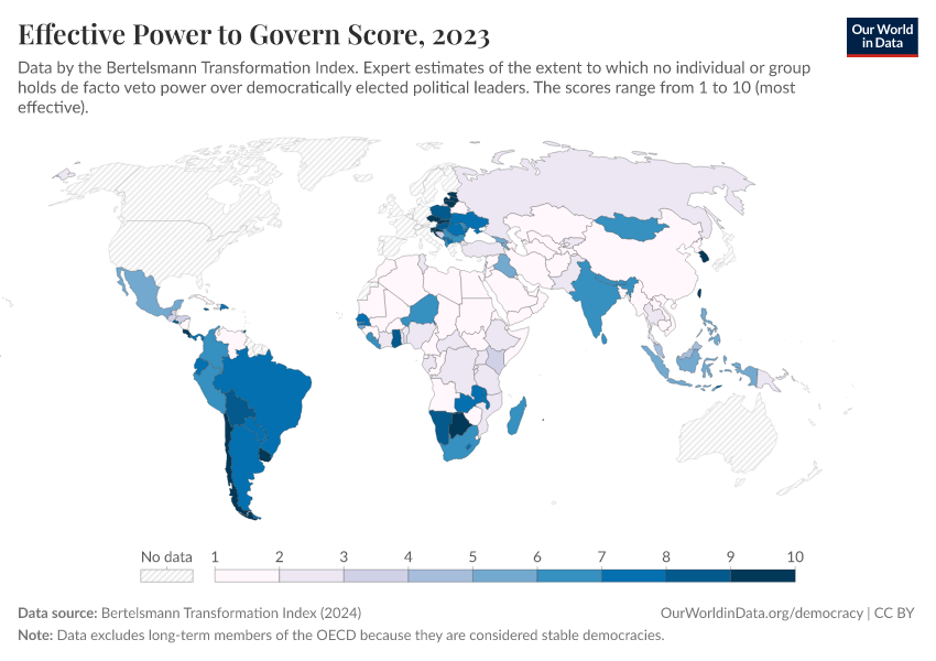 “Data Page: Effective Power to Govern Score”, part of the following publication: Bastian Herre, Lucas Rodés-Guirao, and Esteban Ortiz-Ospina (2013) - “Democracy”. Data adapted from Bertelsmann Transformation Index. Retrieved from https://data-diet-americans.owid.pages.dev:8789/20260204-170225/grapher/effective-power-to-govern-score-bti.html [online resource] (archived on February 4, 2026).How to cite this data