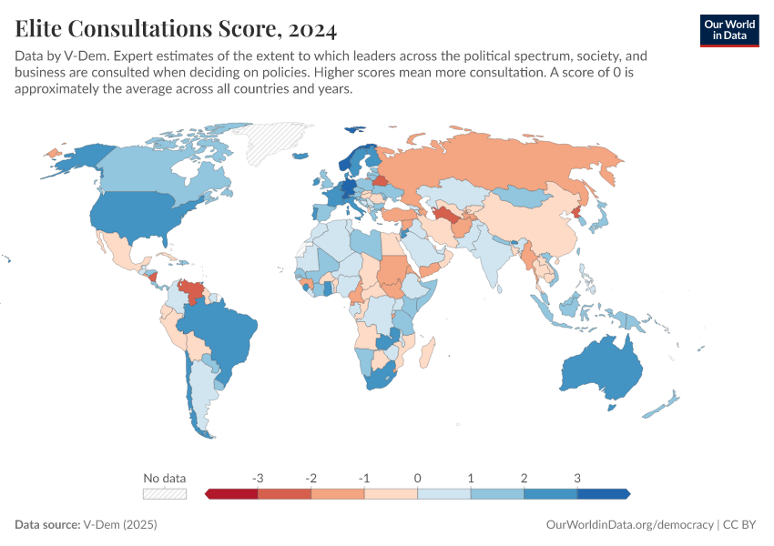 “Data Page: Elite consultation”, part of the following publication: Bastian Herre, Lucas Rodés-Guirao, and Esteban Ortiz-Ospina (2013) - “Democracy”. Data adapted from V-Dem. Retrieved from https://data-diet-americans.owid.pages.dev:8789/20260204-170225/grapher/elite-consultations-score.html [online resource] (archived on February 4, 2026).How to cite this data