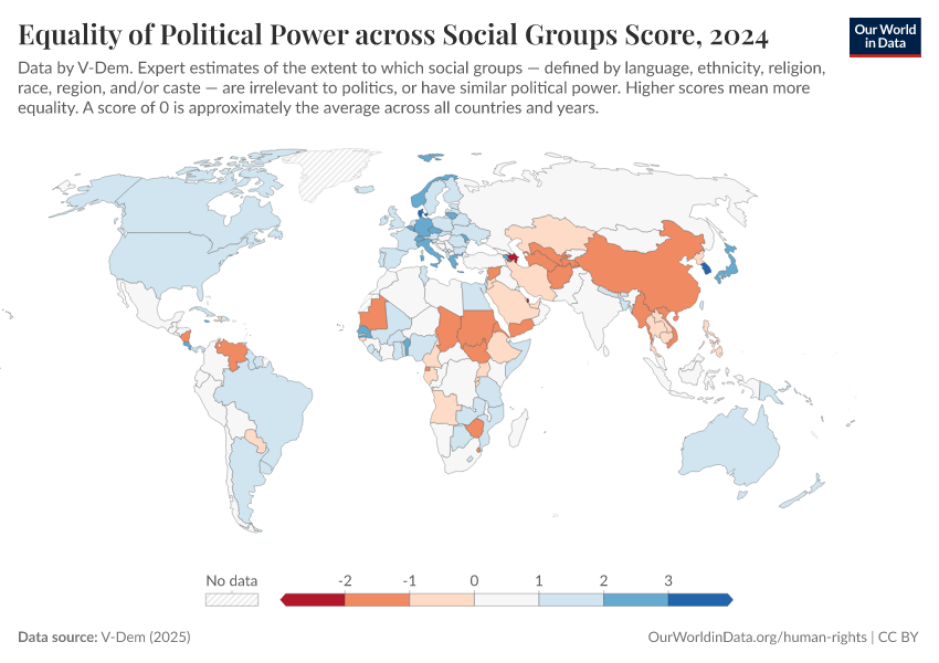 “Data Page: Equality of political power across social groups”, part of the following publication: Bastian Herre, Lucas Rodés-Guirao, and Esteban Ortiz-Ospina (2013) - “Democracy”. Data adapted from V-Dem. Retrieved from https://data-diet-americans.owid.pages.dev:8789/20260204-170225/grapher/equality-of-political-power-across-social-groups-score.html [online resource] (archived on February 4, 2026).How to cite this data
