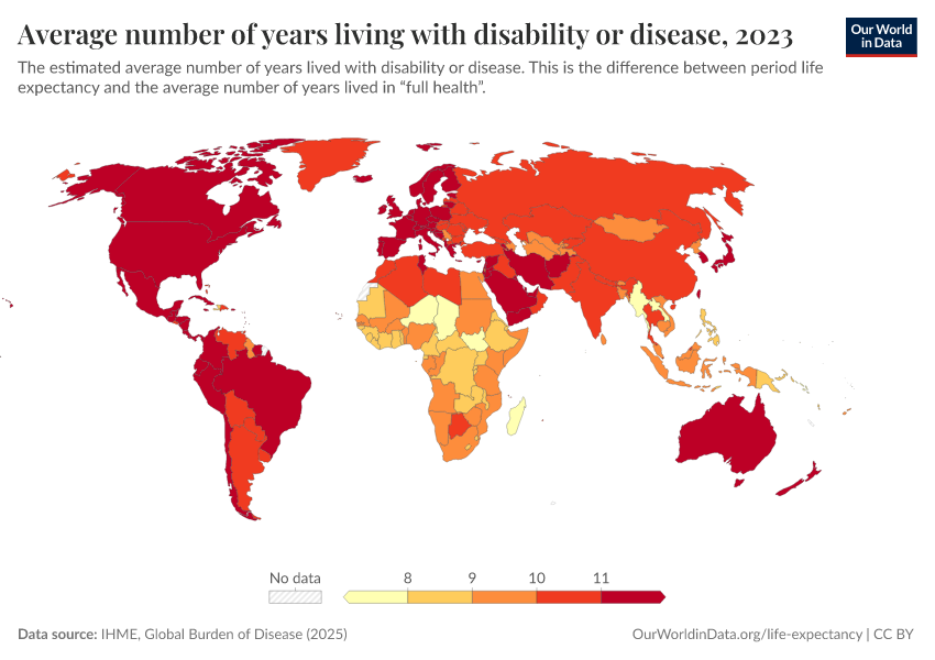 “Data Page: Average number of years living with disability or disease”, part of the following publication: Saloni Dattani, Lucas Rodés-Guirao, Hannah Ritchie, Esteban Ortiz-Ospina, and Max Roser (2023) - “Life Expectancy”. Data adapted from IHME, Global Burden of Disease. Retrieved from https://data-diet-americans.owid.pages.dev:8789/20260213-171235/grapher/expected-years-of-living-with-disability-or-disease-burden.html [online resource] (archived on February 13, 2026).How to cite this data