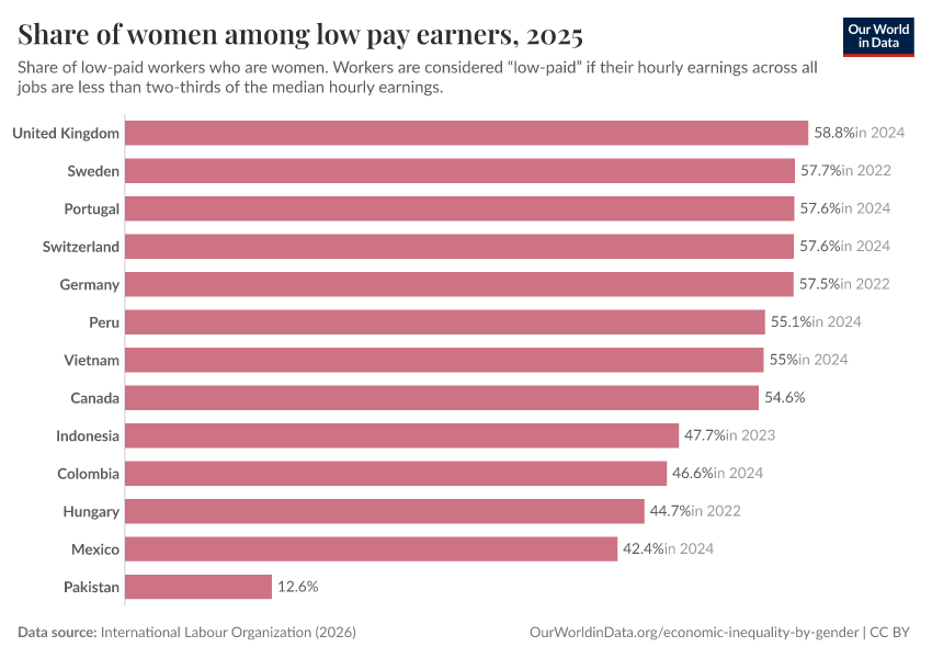 “Data Page: Share of women among low pay earners”. Our World in Data (2026). Data adapted from International Labour Organization. Retrieved from https://data-diet-americans.owid.pages.dev:8789/20260211-165747/grapher/female-share-of-low-pay-earners.html [online resource] (archived on February 11, 2026).How to cite this data