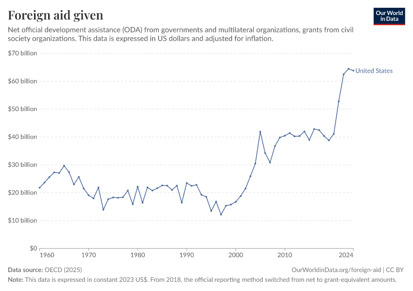 “Data Page: Foreign aid given”, part of the following publication: Bastian Herre, Pablo Arriagada, Simon van Teutem, and Hannah Ritchie (2024) - “Foreign Aid”. Data adapted from OECD. Retrieved from https://data-diet-americans.owid.pages.dev:8789/20251230-141326/grapher/foreign-aid-given-net.html [online resource] (archived on December 30, 2025).How to cite this data