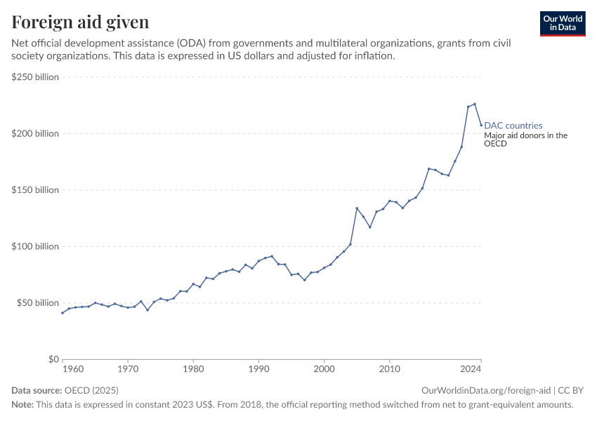 “Data Page: Foreign aid given”, part of the following publication: Bastian Herre, Pablo Arriagada, Simon van Teutem, and Hannah Ritchie (2024) - “Foreign Aid”. Data adapted from OECD. Retrieved from https://data-diet-americans.owid.pages.dev:8789/20251230-141326/grapher/foreign-aid-given-net.html [online resource] (archived on December 30, 2025).How to cite this data